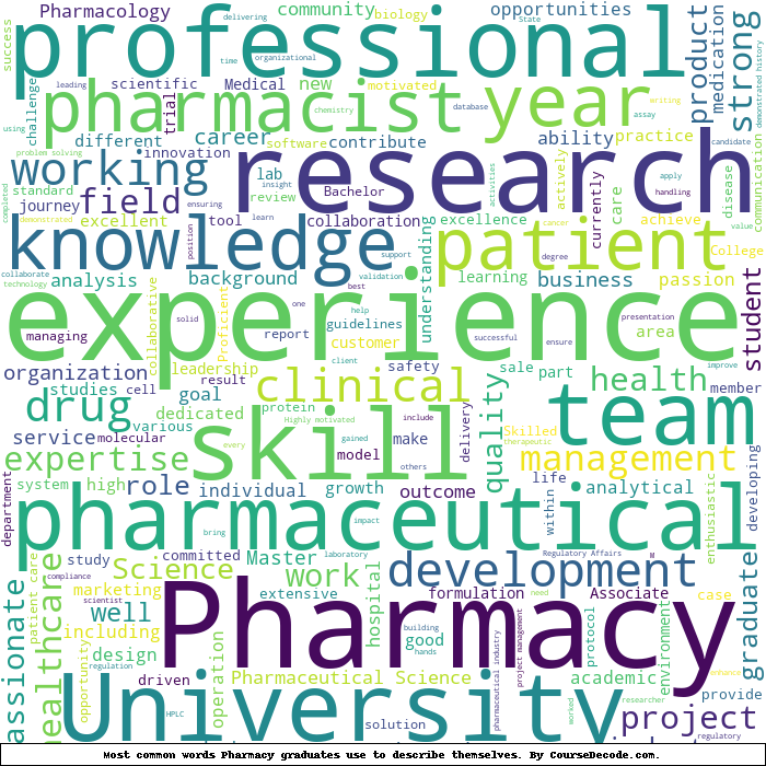 Here is a visual representation of the most common words seen in the "about" section of LinkedIn profiles who have a Bachelor degree in Pharmacy. This may or may not be useful: