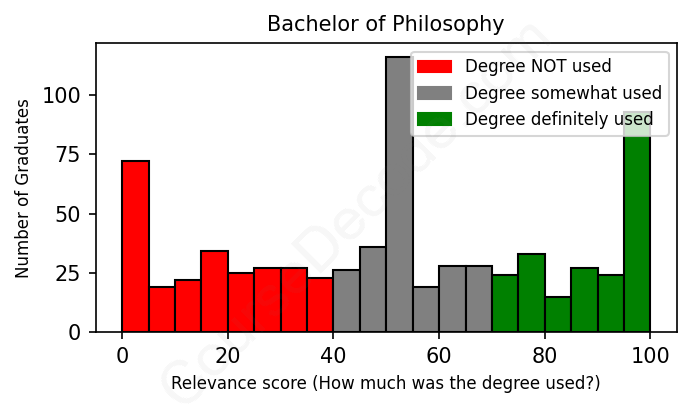 The verdict? Significantly below average. Overall, with an average relevance score of 50%, Philosophy graduates have a much lower likelihood (-17%) of finding work in this field compared to the average graduate across all fields: