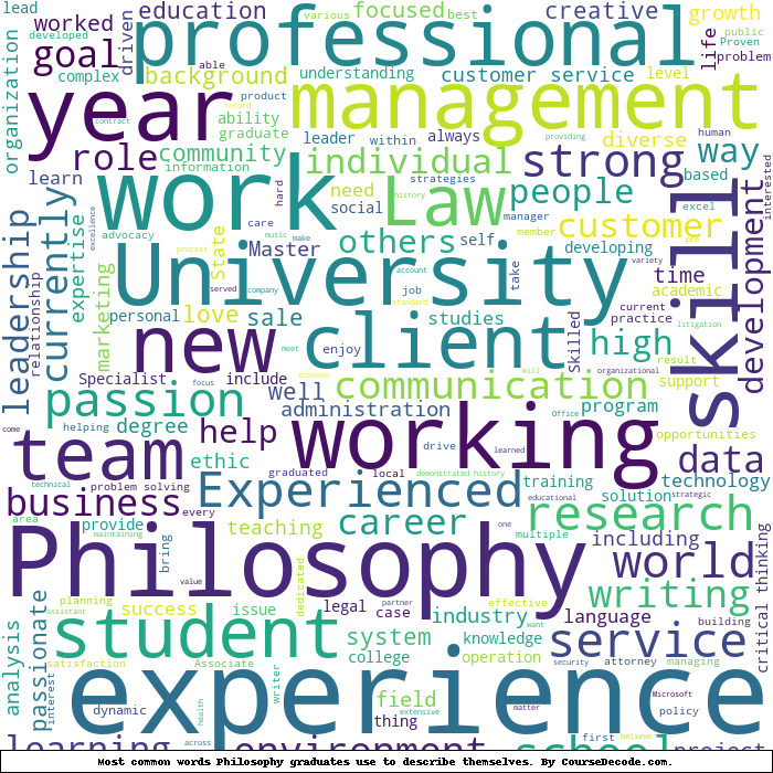 Here is a visual representation of the most common words seen in the "about" section of LinkedIn profiles who have a Bachelor degree in Philosophy. This may or may not be useful: