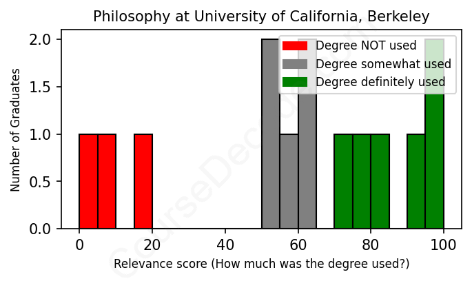 The verdict? Below average. Overall, with an average relevance score of 59%, Philosophy graduates from University of California, Berkeley have a lower likelihood (-8%) of finding work in this field compared to the average graduate across all fields: