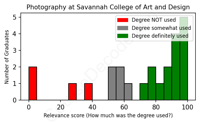 The verdict? Slightly above average. Overall, with an average relevance score of 70%, Photography graduates from Savannah College of Art and Design have a slightly higher likelihood (+3%) of finding work in this field compared to the average graduate across all fields: