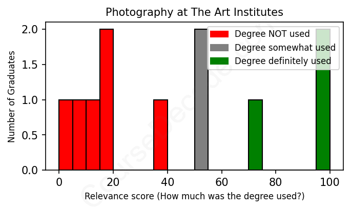 The verdict? Bad. Overall, with an average relevance score of 42%, Photography graduates from The Art Institutes have a substantially lower likelihood (-25%) of finding work in this field compared to the average graduate across all fields: