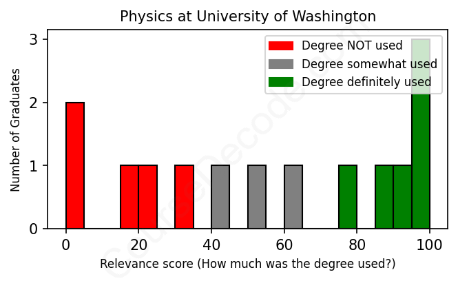 The verdict? Significantly below average. Overall, with an average relevance score of 55%, Physics graduates from University of Washington have a much lower likelihood (-12%) of finding work in this field compared to the average graduate across all fields: