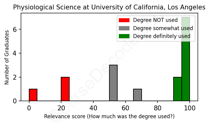 The verdict? Slightly above average. Overall, with an average relevance score of 71%, Physiological Science graduates from University of California, Los Angeles have a slightly higher likelihood (+4%) of finding work in this field compared to the average graduate across all fields: