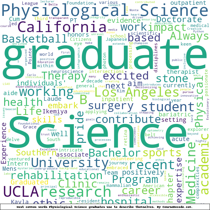 Here is a visual representation of the most common words seen in the "about" section of LinkedIn profiles who have a Bachelor degree in Physiological Science (this is across all Physiological Science graduates we've analyzed, not just those who went to University of California, Los Angeles). This may or may not be useful: