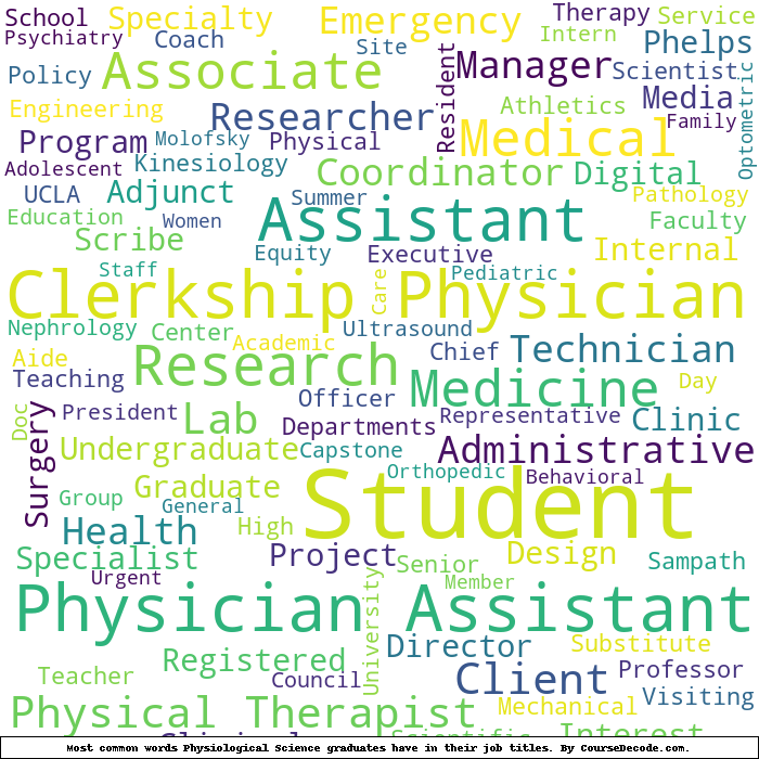 Here is a visual representation of the most common words in job titles for Physiological Science graduates (this is across all Physiological Science graduates we've analyzed, not just those who went to University of California, Los Angeles):