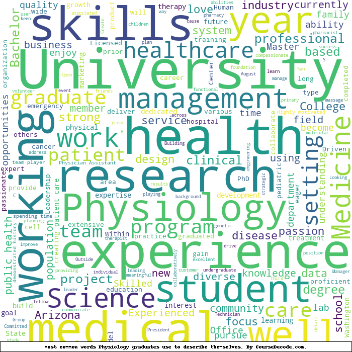 Here is a visual representation of the most common words seen in the "about" section of LinkedIn profiles who have a Bachelor degree in Physiology. This may or may not be useful: