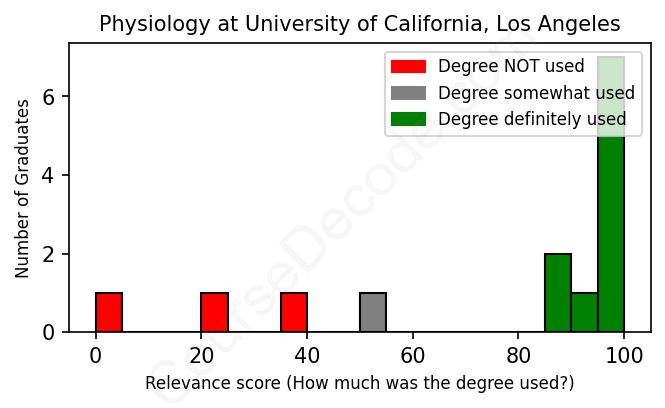 The verdict? Above average. Overall, with an average relevance score of 76%, Physiology graduates from University of California, Los Angeles have a higher likelihood (+9%) of finding work in this field compared to the average graduate across all fields: