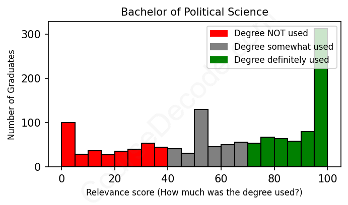 The verdict? Below average. Overall, with an average relevance score of 61%, Political Science graduates have a lower likelihood (-6%) of finding work in this field compared to the average graduate across all fields:
