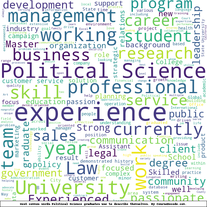 Here is a visual representation of the most common words seen in the "about" section of LinkedIn profiles who have a Bachelor degree in Political Science. This may or may not be useful: