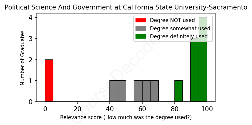 The verdict? Slightly above average. Overall, with an average relevance score of 69%, Political Science And Government graduates from California State University-Sacramento have a slightly higher likelihood (+2%) of finding work in this field compared to the average graduate across all fields: