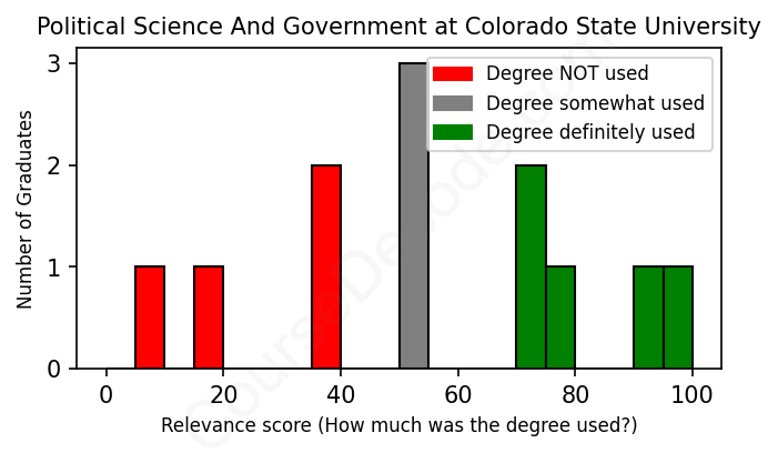 The verdict? Significantly below average. Overall, with an average relevance score of 54%, Political Science And Government graduates from Colorado State University have a much lower likelihood (-13%) of finding work in this field compared to the average graduate across all fields: