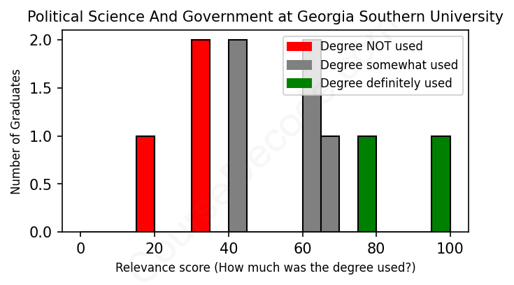 The verdict? Significantly below average. Overall, with an average relevance score of 53%, Political Science And Government graduates from Georgia Southern University have a much lower likelihood (-14%) of finding work in this field compared to the average graduate across all fields: