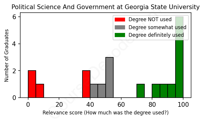 The verdict? Slightly below average. Overall, with an average relevance score of 62%, Political Science And Government graduates from Georgia State University have a slightly lower likelihood (-5%) of finding work in this field compared to the average graduate across all fields: