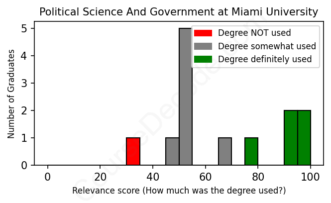 The verdict? Slightly below average. Overall, with an average relevance score of 66%, Political Science And Government graduates from Miami University have a slightly lower likelihood (-1%) of finding work in this field compared to the average graduate across all fields: