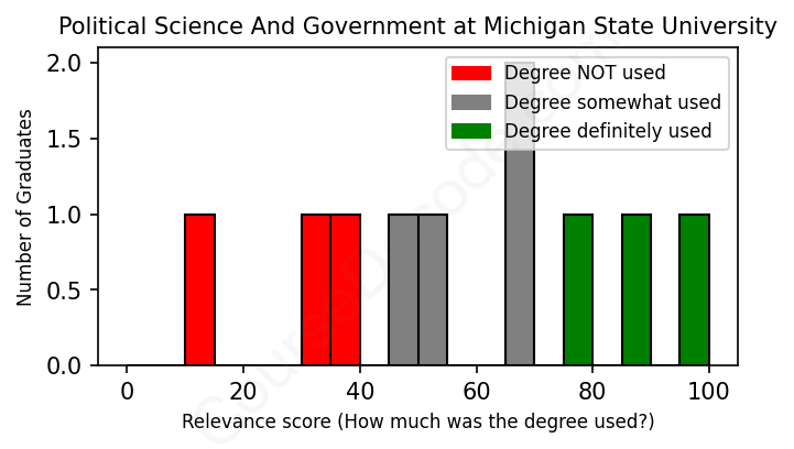 The verdict? Below average. Overall, with an average relevance score of 57%, Political Science And Government graduates from Michigan State University have a lower likelihood (-10%) of finding work in this field compared to the average graduate across all fields: