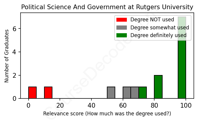 The verdict? Above average. Overall, with an average relevance score of 75%, Political Science And Government graduates from Rutgers University have a higher likelihood (+8%) of finding work in this field compared to the average graduate across all fields: