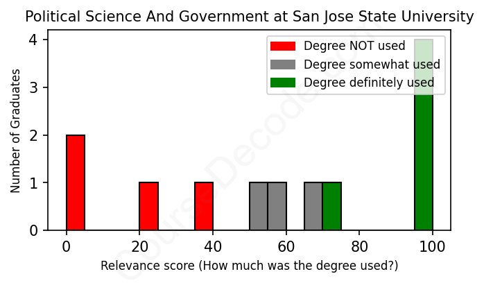 The verdict? Below average. Overall, with an average relevance score of 58%, Political Science And Government graduates from San Jose State University have a lower likelihood (-9%) of finding work in this field compared to the average graduate across all fields: