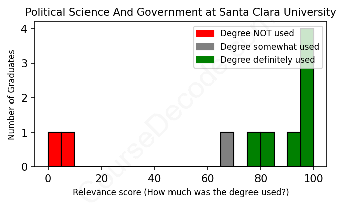 The verdict? Slightly above average. Overall, with an average relevance score of 71%, Political Science And Government graduates from Santa Clara University have a slightly higher likelihood (+4%) of finding work in this field compared to the average graduate across all fields: