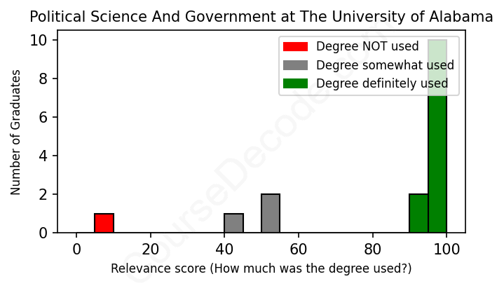 The verdict? Significantly above average. Overall, with an average relevance score of 83%, Political Science And Government graduates from The University of Alabama have a much higher likelihood (+16%) of finding work in this field compared to the average graduate across all fields: