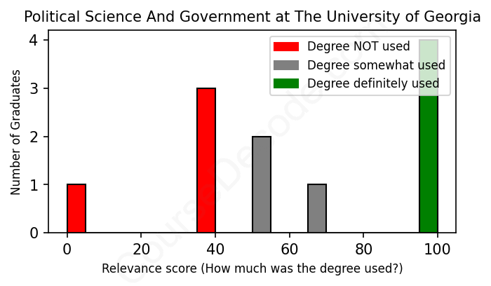 The verdict? Below average. Overall, with an average relevance score of 61%, Political Science And Government graduates from The University of Georgia have a lower likelihood (-6%) of finding work in this field compared to the average graduate across all fields: