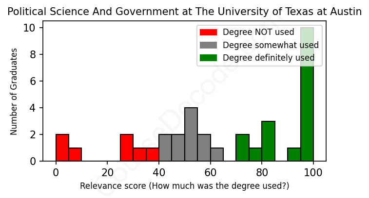 The verdict? Slightly below average. Overall, with an average relevance score of 64%, Political Science And Government graduates from The University of Texas at Austin have a slightly lower likelihood (-3%) of finding work in this field compared to the average graduate across all fields: