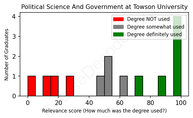 The verdict? Below average. Overall, with an average relevance score of 59%, Political Science And Government graduates from Towson University have a lower likelihood (-8%) of finding work in this field compared to the average graduate across all fields: