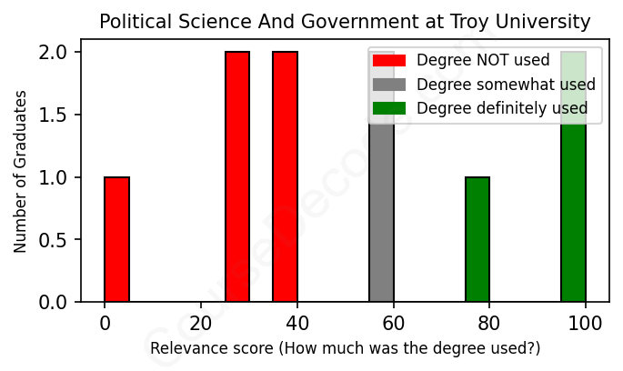 The verdict? Significantly below average. Overall, with an average relevance score of 51%, Political Science And Government graduates from Troy University have a much lower likelihood (-16%) of finding work in this field compared to the average graduate across all fields:
