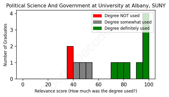 The verdict? Slightly above average. Overall, with an average relevance score of 72%, Political Science And Government graduates from University at Albany, SUNY have a slightly higher likelihood (+5%) of finding work in this field compared to the average graduate across all fields: