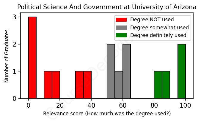 The verdict? Bad. Overall, with an average relevance score of 46%, Political Science And Government graduates from University of Arizona have a substantially lower likelihood (-21%) of finding work in this field compared to the average graduate across all fields: