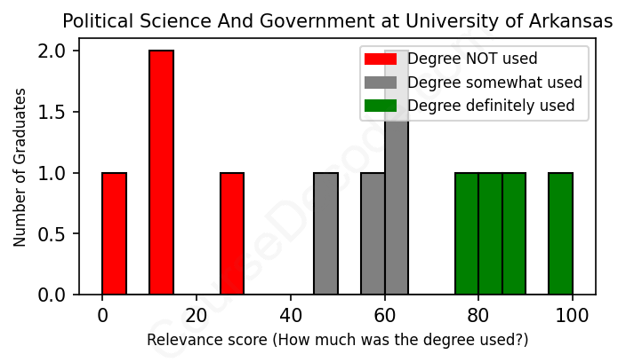 The verdict? Significantly below average. Overall, with an average relevance score of 52%, Political Science And Government graduates from University of Arkansas have a much lower likelihood (-15%) of finding work in this field compared to the average graduate across all fields: