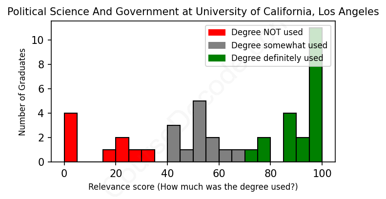 The verdict? Slightly below average. Overall, with an average relevance score of 62%, Political Science And Government graduates from University of California, Los Angeles have a slightly lower likelihood (-5%) of finding work in this field compared to the average graduate across all fields: