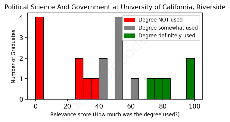 The verdict? Bad. Overall, with an average relevance score of 45%, Political Science And Government graduates from University of California, Riverside have a substantially lower likelihood (-22%) of finding work in this field compared to the average graduate across all fields: