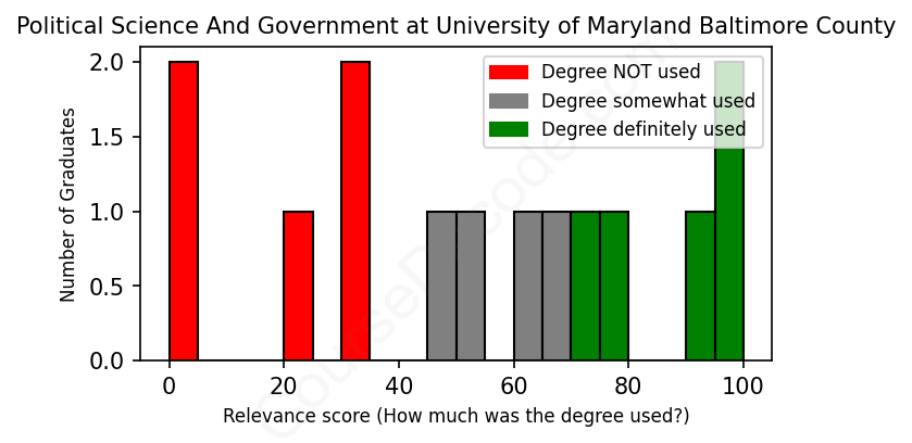 First, some facts. Of the Political Science And Government graduates from University of Maryland Baltimore County we've analyzed , here's how many have used (or NOT used) their degree in their career: