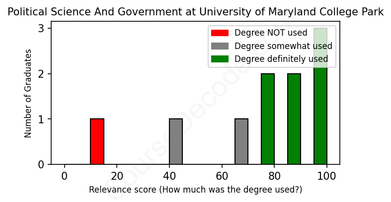 First, some facts. Of the Political Science And Government graduates from University of Maryland College Park we've analyzed , here's how many have used (or NOT used) their degree in their career: