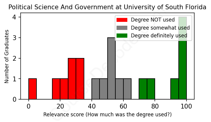The verdict? Significantly below average. Overall, with an average relevance score of 55%, Political Science And Government graduates from University of South Florida have a much lower likelihood (-12%) of finding work in this field compared to the average graduate across all fields: