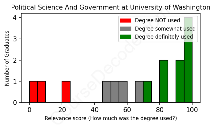 The verdict? Slightly below average. Overall, with an average relevance score of 66%, Political Science And Government graduates from University of Washington have a slightly lower likelihood (-1%) of finding work in this field compared to the average graduate across all fields: