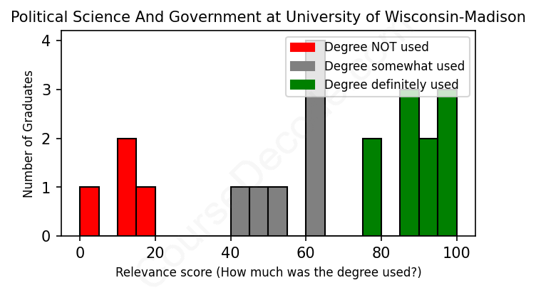 The verdict? Slightly below average. Overall, with an average relevance score of 62%, Political Science And Government graduates from University of Wisconsin-Madison have a slightly lower likelihood (-5%) of finding work in this field compared to the average graduate across all fields: