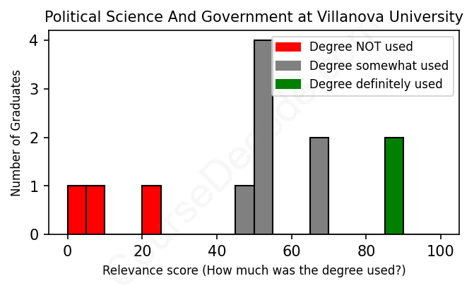 The verdict? Significantly below average. Overall, with an average relevance score of 49%, Political Science And Government graduates from Villanova University have a much lower likelihood (-18%) of finding work in this field compared to the average graduate across all fields:
