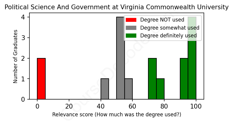 The verdict? Slightly below average. Overall, with an average relevance score of 65%, Political Science And Government graduates from Virginia Commonwealth University have a slightly lower likelihood (-2%) of finding work in this field compared to the average graduate across all fields: