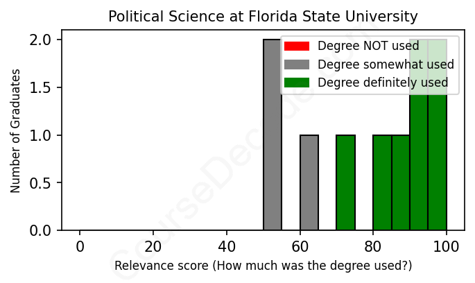 The verdict? Significantly above average. Overall, with an average relevance score of 79%, Political Science graduates from Florida State University have a much higher likelihood (+12%) of finding work in this field compared to the average graduate across all fields: