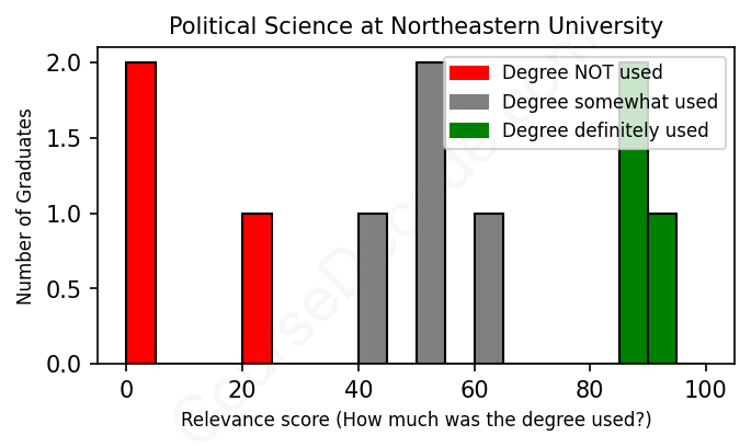 The verdict? Significantly below average. Overall, with an average relevance score of 49%, Political Science graduates from Northeastern University have a much lower likelihood (-18%) of finding work in this field compared to the average graduate across all fields: