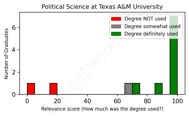 The verdict? Above average. Overall, with an average relevance score of 77%, Political Science graduates from Texas A&M University have a higher likelihood (+10%) of finding work in this field compared to the average graduate across all fields:
