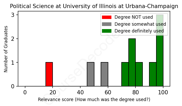 The verdict? Above average. Overall, with an average relevance score of 74%, Political Science graduates from University of Illinois at Urbana-Champaign have a higher likelihood (+7%) of finding work in this field compared to the average graduate across all fields:
