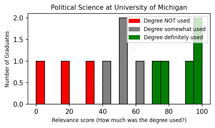 The verdict? Below average. Overall, with an average relevance score of 57%, Political Science graduates from University of Michigan have a lower likelihood (-10%) of finding work in this field compared to the average graduate across all fields: