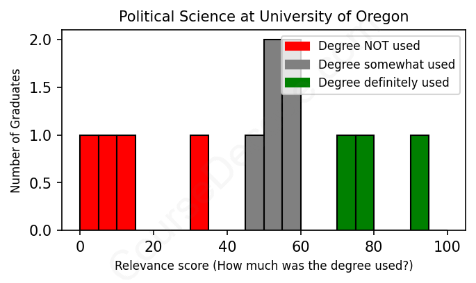 The verdict? Bad. Overall, with an average relevance score of 46%, Political Science graduates from University of Oregon have a substantially lower likelihood (-21%) of finding work in this field compared to the average graduate across all fields: