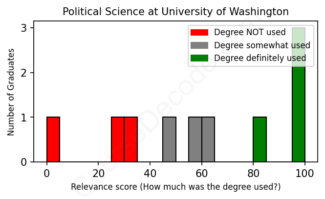 The verdict? Below average. Overall, with an average relevance score of 60%, Political Science graduates from University of Washington have a lower likelihood (-7%) of finding work in this field compared to the average graduate across all fields: