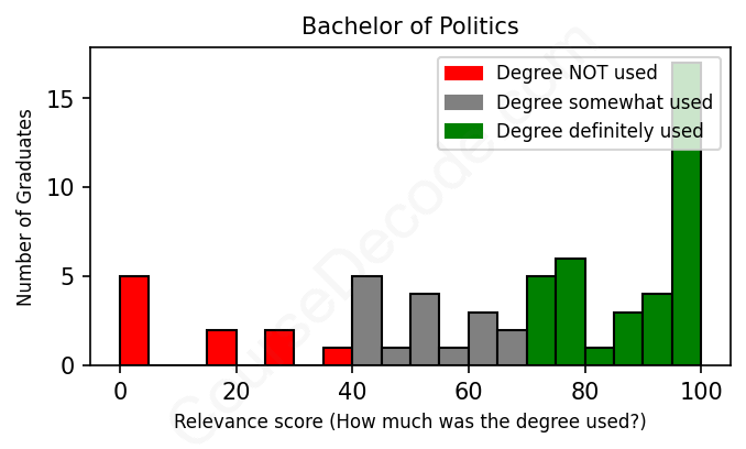 The verdict? On par with the average. Overall, with an average relevance score of 67%, Politics graduates have about the same likelihood of finding work in this field as the average graduate across all fields:
