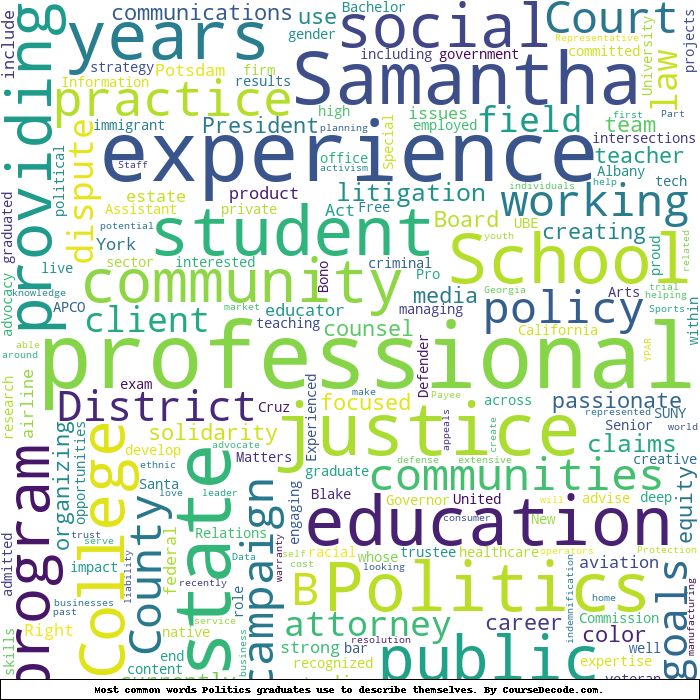 Here is a visual representation of the most common words seen in the "about" section of LinkedIn profiles who have a Bachelor degree in Politics. This may or may not be useful: