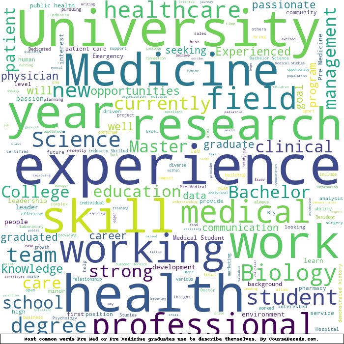 Here is a visual representation of the most common words seen in the "about" section of LinkedIn profiles who have a Bachelor degree in Pre Med or Pre Medicine. This may or may not be useful: